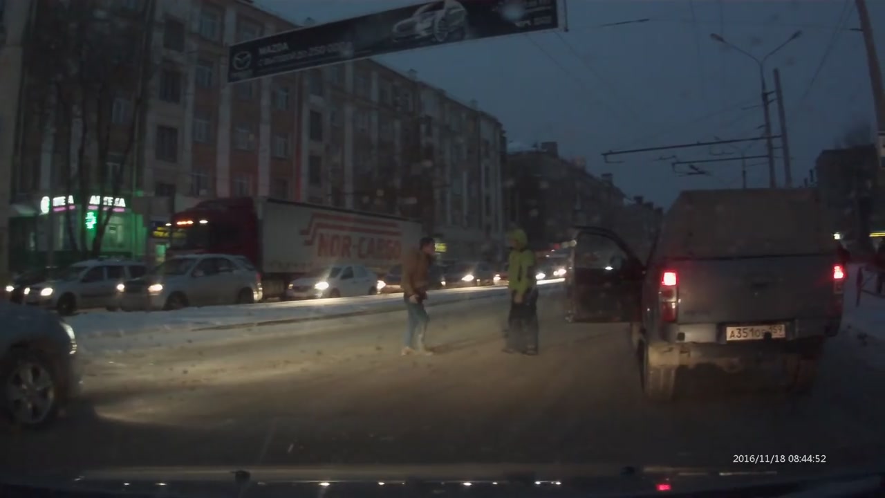 Пермь. На съемке видно, как водитель Мazda оставляет свою машину на дороге и бросается с кулаками на прохожего, который в тот момент пересекал проезжую часть. На ней же и развернулось противостояние. Конфликтующие били и бросали друг друга на покрытый снегом асфальт, не замечая проезжающих мимо автомобилей. При этом чем закончился конфликт, не сообщается. Видео очевидца обрывается в тот момент, когда схватка перемещается на обочину. По словам свидетелей, она началась из-за того, что пешеход грубо ответил автомобилисту.