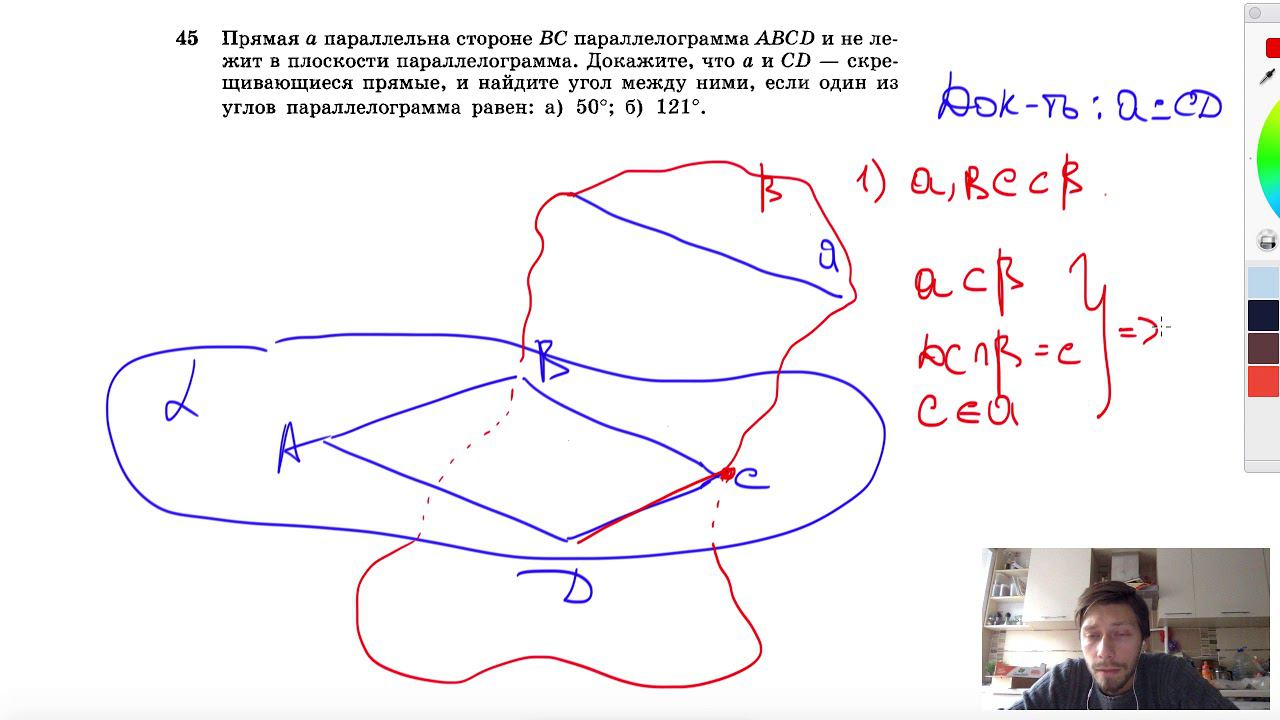 №45. Прямая а параллельна стороне ВС параллелограмма ABCD и не лежит в плоскости параллелограмма. Докажите, что а и CD — скрещивающиеся прямые, и найдите угол между ними, если один из углов параллелограмма равен: а) 50°; б) 121°. Мой второй канал для подготовки к ЕГЭ и ОГЭ - https://www.youtube.com/ЕвгенийСумин Инстаграм - https://www.instagram.com/EGE_OGE.math Личный инстаграм - https://www.instagram.com/ee_sumin VK - https://vk.com/evgeniysumin FB - https://www.facebook.com/EvgeniySumin