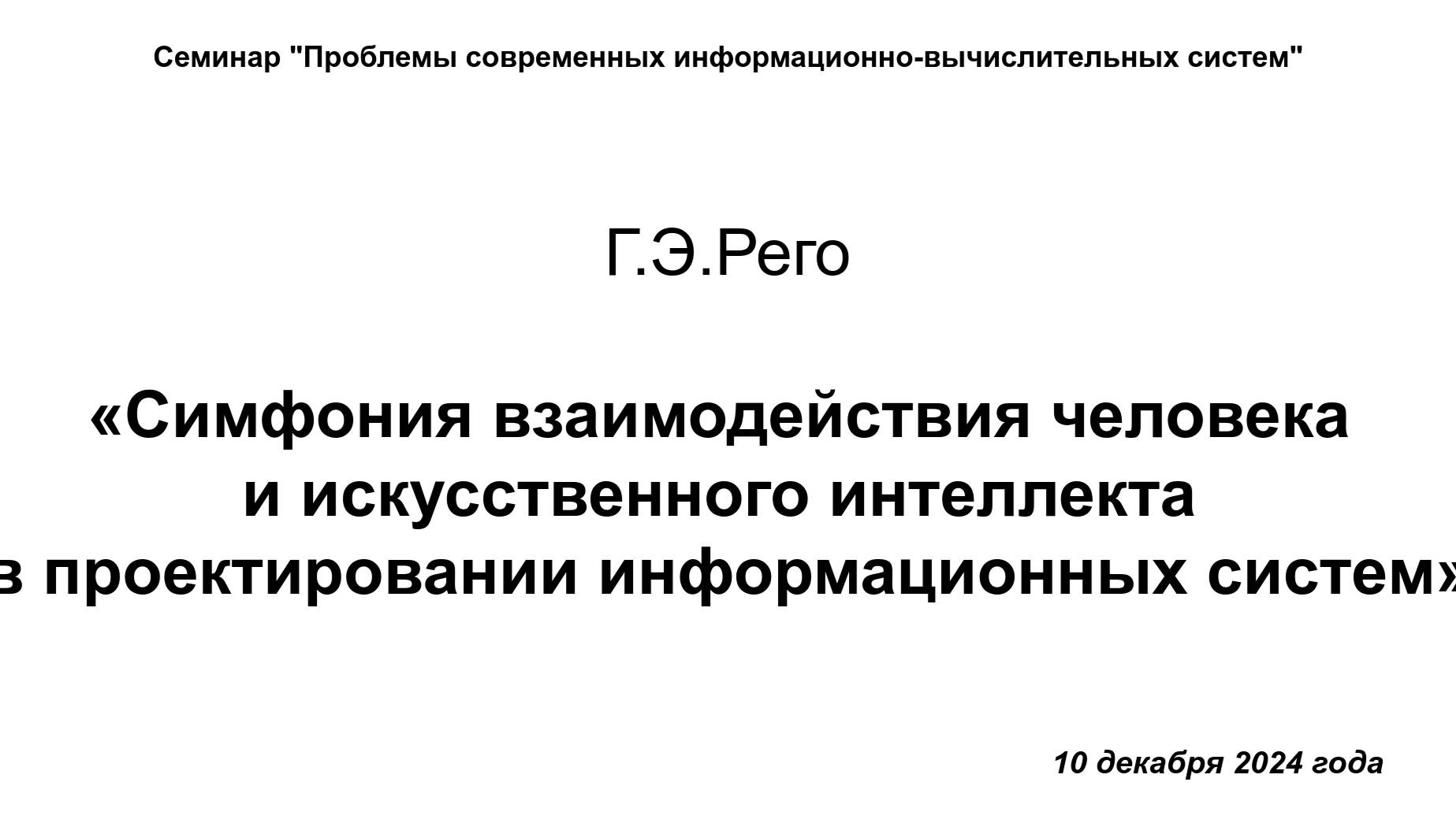 Симфония взаимодействия человека и искусственного интеллекта в проектировании информационных систем Аннотация доклада. Предложен метод проектирования информационной системы (ИС) с акцентом на применение интеллектуальных чат-ботов. Анализ существующих чат-ботов показывает, что текущие решения не обладают способностью формулировать требования к ИС при проектировании без участия человека. В исследовании предлагается интегрировать ChatGPT (модель GPT4) в качестве чат-бота для решения задачи выявления требований к написанию ИС. Предложенный метод решения задачи основан на постепенном снижении энтропии ответа чат-бота, что может быть достигнуто путем управления такими основными параметрами запроса, как форма, глубина и ширина подсказки. На основе предложенного метода разработан алгоритм управления подсказками во время диалога с чат-ботом, регулирующий форму, глубину и ширину вопроса для получения необходимого уровня содержательности в ответе. В ходе исследования получены следующие результаты: разработан метод получения новых знаний на основе снижения энтропии ответа чат-бота; алгоритм управления подсказками; второй этап разработки ИС автоматизирован (включая выявление бизнес-требований и целей системы; анализ существующих решений и технологий; определение функциональных требований и возможностей системы; разработка архитектуры системы, включая определение и взаимодействие сервисов; создание интерфейсов для взаимодействия сервисов; создание модели данных и базы данных и формулирование логики бизнес-процессов). Метод был апробирован для проектирования ИС для поддержки принятия стратегических решений в лесной отрасли. Результаты проектирования получили положительную оценку экспертов. Анализ полученных результатов выявил преимущества и ограничения использования чат-ботов в качестве «второго пилота» при проектировании ИС и наметил направления будущих исследований.