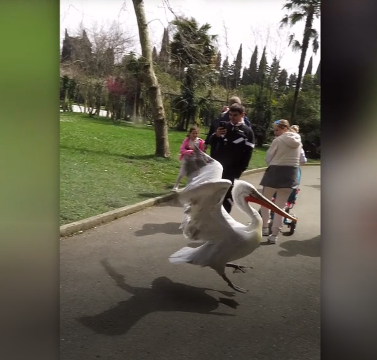Ему так люди надоели,бежит от них он всю неделю.Это друзья пеликан из Сочинского Дендрария.