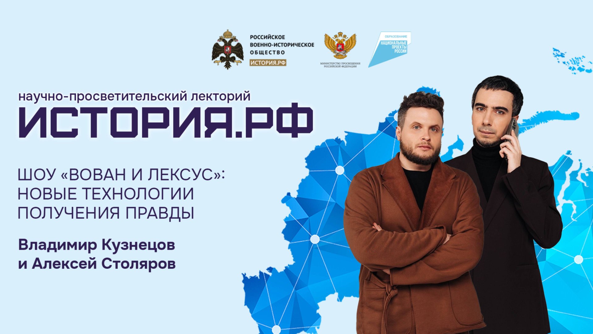 25 октября в 13:45 стартует шоу «Вован и Лексус»: новые технологии получения правды». Пранкеры Владимир Кузнецов и Алексей Столяров выступят на площадке первого научно-просветительского лектория РВИО «История.РФ». Организаторы: РВИО при поддержке Министерства просвещения Российской Федерации в рамках национального проекта «Образование».