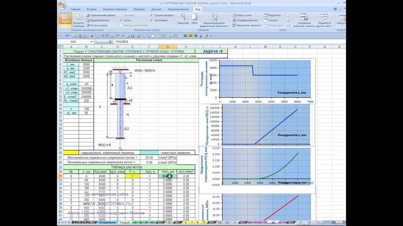 Получить сам автоматизированный Excel-шаблон "Растяжение-сжатие стержней" со всеми 18 задачами (шаблонами) можно на сайте ps1besplatno.mcdir.ru. В видео уроке 5 рассмотрен задачи растяжения-сжатия стержней с упругими опорами и растяжение-сжатие стержней в упругой среде. http://www.youtube.com/watch?v=2G0oD_-8c-U