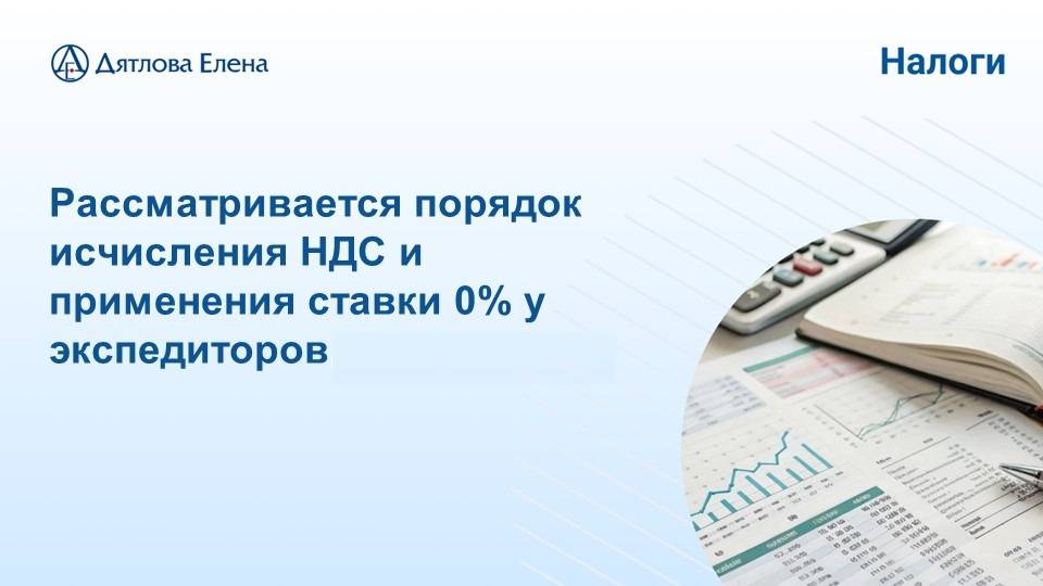 Порядок исчисления НДС и применения ставки 0% у экспедиторов обсуждаем с Е.М. Дятловой. Е.М. Дятлова - налоговый консультант, эксперт-практик в решении самых сложных вопросов по бухгалтерскому учету и налогообложению с опытом работы 28 лет. 3500 клиентов по всей России . Вебинары и мнение профессионала по налогообложению найдете на нашем сайте https://buchguru.vip.