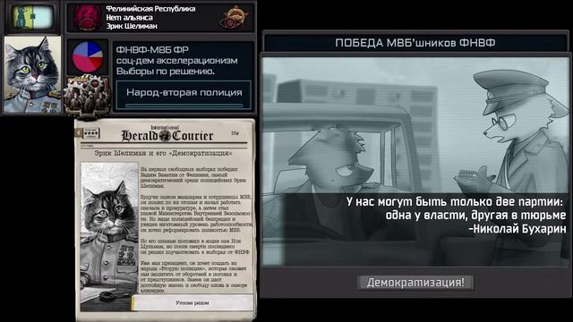 Всегда случается херня, из-за которой производство чуть-чуть увеличатся. Но да ладно. Вот он- предпоследняя часть ремастера выборов 2023 года в Фелинии. Дальше только малые партии(Фаши, Философы, монархисты и тд). Таймкоды: 0:00-Интро 0:03-Грампи Кэт 0:53-Чмоня 1:24-Эрик Шелиман 2:27-Роуз Хаммерхэд