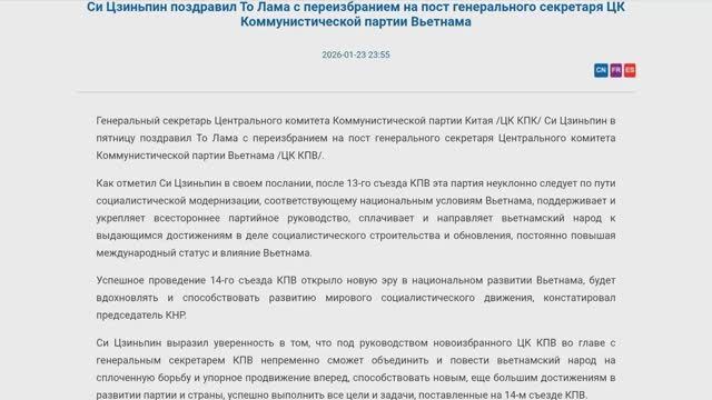 Смотрите плейлисты: Новости Китая https://rutube.ru/plst/1434841 Новости политики https://rutube.ru/plst/921867 Министерство иностранных дел Китайской Народной Республики Си Цзиньпин поздравил То Лама с переизбранием на пост генерального секретаря ЦК Коммунистической партии Вьетнама 2026-01-23 23:55 Генеральный секретарь Центрального комитета Коммунистической партии Китая /ЦК КПК/ Си Цзиньпин в пятницу поздравил То Лама с переизбранием на пост генерального секретаря Центрального комитета Коммунистической партии Вьетнама /ЦК КПВ/. Как отметил Си Цзиньпин в своем послании, после 13-го съезда КПВ эта партия неуклонно следует по пути социалистической модернизации, соответствующему национальным условиям Вьетнама, поддерживает и укрепляет всестороннее партийное руководство, сплачивает и направляет вьетнамский народ к выдающимся достижениям в деле социалистического строительства и обновления, постоянно повышая международный статус и влияние Вьетнама. Успешное проведение 14-го съезда КПВ открыло новую эру в национальном развитии Вьетнама, будет вдохновлять и способствовать развитию мирового социалистического движения, констатировал председатель КНР. Си Цзиньпин выразил уверенность в том, что под руководством новоизбранного ЦК КПВ во главе с генеральным секретарем КПВ непременно сможет объединить и повести вьетнамский народ на сплоченную борьбу и упорное продвижение вперед, способствовать новым, еще большим достижениям в развитии партии и страны, успешно выполнить все цели и задачи, поставленные на 14-м съезде КПВ. Китайский лидер назвал Китай и Вьетнам дружественными социалистическими соседями и членами сообщества единой судьбы, имеющего стратегическое значение. Си Цзиньпин заверил, что он придает большое значение отношениям между двумя партиями и двумя странами и готов совместно с То Ламом укреплять стратегическую коммуникацию, развивать традиционную дружбу, твердо продвигать дело социализма, направлять китайско-вьетнамские отношения всеобъемлющего стратегического сотрудничества и построение сообщества единой судьбы Китая и Вьетнама к непрерывному достижению весомых результатов, чтобы принести больше пользы народам двух стран и внести позитивный вклад в мир, стабильность, развитие и процветание в регионе и во всем мире.
