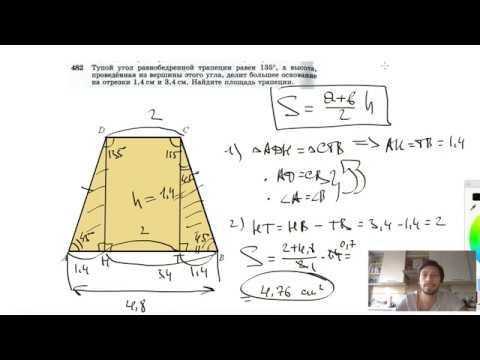 №482. Тупой угол равнобедренной трапеции равен 135°, а высота, проведенная из вершины этого угла, делит большее основание на отрезки 1,4 см и 3,4 см. Найдите площадь трапеции. Поддержать канал рублём - 5469400944002125 (Сбербанк) Мой второй канал для подготовки к ЕГЭ и ОГЭ - https://www.youtube.com/ЕвгенийСумин Инстаграм - https://www.instagram.com/EGE_OGE.math Личный инстаграм - https://www.instagram.com/ee_sumin VK - https://vk.com/evgeniysumin FB - https://www.facebook.com/EvgeniySumin