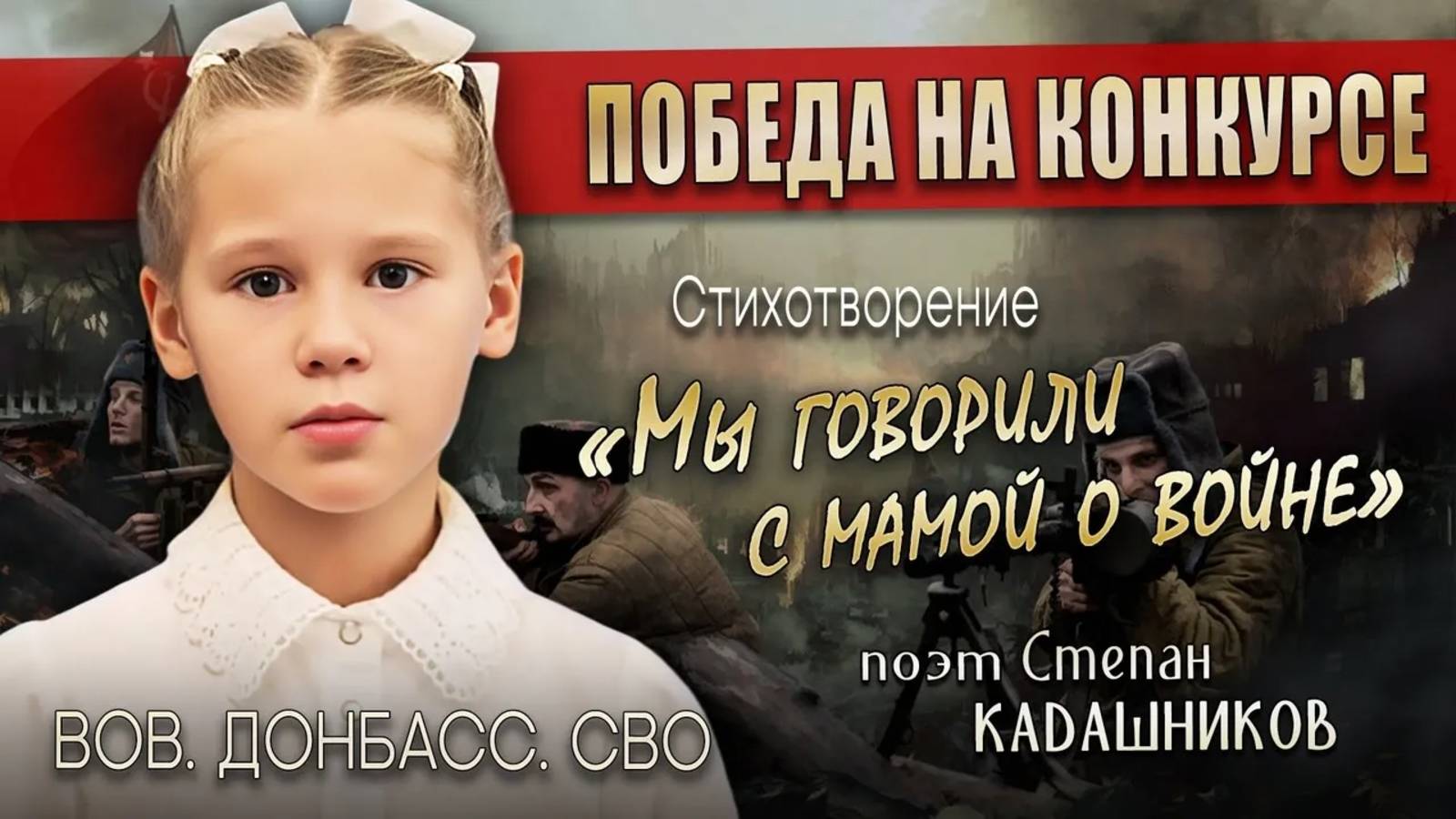 🏆🔥 Новая победа на конкурсе! Диплом и кубок победителя конкурса "Учись у героев отчизну беречь" со стихотворением Степана Кадашникова "Мы говорили с мамой о войне" завоевала юная чемпионка по карате, гимнастка из Владивостока, семилетняя Александра Понкратова, ученица 1 класса школы №17. На конкурсе ко Дню Героев Отечества стихотворение звучало в номинации "Героям мы посвящаем эти строки". Александра чемпионка Дальнего востока и многократный победитель по полноконтактному карате киокушинкай, победитель соревнований по художественной гимнастике и хореографии. Также школьница занимается плаванием, шахматами, игре на ложках, каллиграфией и изучает китайский язык. Видео выступления дочери к нам в группу прислал папа Александры, Сергей Понкратов. Поздравляем Александру с заслуженной победой! ✅ Актёры, певцы, известные спортсмены, военнослужащие и их жёны, депутаты, священники, школьники и дети читают стихи поэта на сайте: 👉 kadashnikov.ru МЫ ГОВОРИЛИ С МАМОЙ О ВОЙНЕ Мы говорили с мамой о войне, О том, как погибали наши предки, Которые не знали обо мне, Но за меня врагов разили метко. За то, чтоб я родился на земле Они мечи из ножен вынимали, И, с Александром Невским во главе, За Русь Святую до конца стояли. Кутузов и Раевский в бой вели Свои полки на Бородинском поле, Чтоб Пушкина с Гамзатовым могли Читать сегодня мы свободно в школе. За то, чтоб я вот так сейчас стоял, И говорил на русском перед Вами, Под Курском, в танке, наш солдат сгорал И бился на Мамаевом кургане. Я не смогу предать былых побед, За этот разговор спасибо маме, Ведь для того, чтоб жить на свете мне, Флаг над Рейхстагом поднимали в мае. Сегодня вновь воюем за Донбасс, За Севастополь, за Херсон и Киев, Чтоб русскую историю и нас Самих, враги не отменили. ©Степан Кадашников ❗ВНИМАНИЕ! Для прочтения от женского лица меняются строки: "За то, чтоб я родился на земле" на строчку: "За то, чтоб родилась я на земле", а строку: "За то, чтоб я вот так сейчас стоял" меняем на строчку: "Чтоб каждый не боясь вот так стоял". 📹 Дорогие друзья, присылайте видео своих выступлений со стихами Степана Кадашникова, администратору в сообщения группы 👉🏻 vk.com/im?sel=-29821466 (Напишите в письме имя чтеца, возраст, город, как нашли и почему выбрали именно это стихотворение, если видео готовилось на конкурс, то напишите для какого конкурса готовили) и мы разместим Ваше видео в группе. Пишите нам, задавайте вопросы - будем рады помочь! Стихотворения о любви и жизни, о Великой Отечественной войне и специальной военной операции сегодня звучат в самых разных регионах страны, на ТВ каналах и радиостанциях России, на концертах и конкурсах. К нам в группу приходит много новых видео, на которых стихи читают дети и студенты, победители различных конкурсов чтецов, фестивалей, акций в поддержку бойцов СВО. Строчки стихов декламируют школьники на Донбассе ко Дню Героев Отечества 9 декабря, ко Дню неизвестного солдата 3 декабря. Стихотворения о погибших на СВО героях, ко Дню Победы в Великой Отечественной войне, строки про Донбасс читают ученики школ и воспитанники детских садов в поддержку наших бойцов на фронте. Стихотворения звучат на различных мероприятиях, акциях и фестивалях, принимают участие в патриотических проектах и конкурсах чтецов. Современные стихи про Великую Отечественную войну и войну на Донбассе, о солдатах воюющ