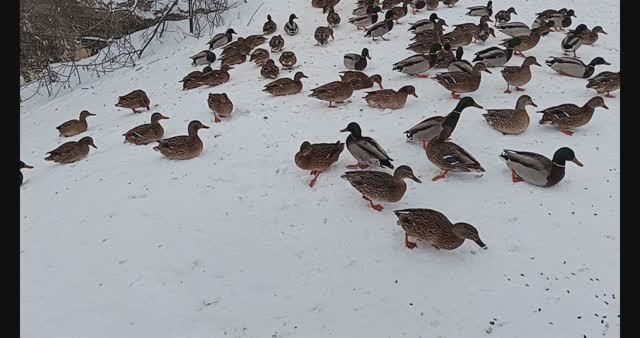 Утки зимуют на плотине. Плотина зимой. Река зимой. Красивая природа зимой.