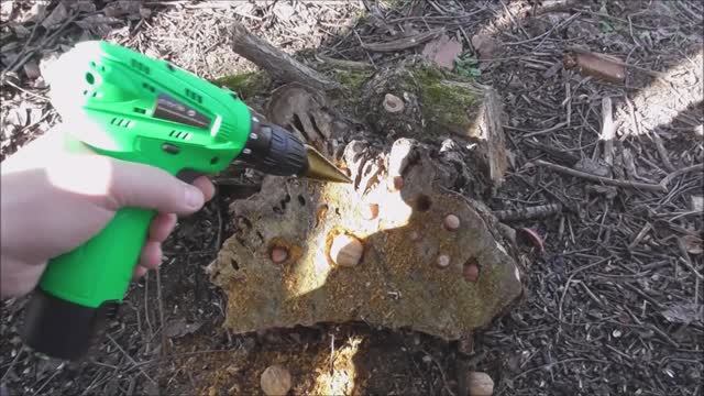Кормушка для дятла. Изгоровление кормушки из пня, удобное место для разлущивания орехов.