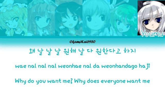 Thank you Momoland for saving 2019 for us(what am I even saying-) So, I did this months ago. I decided to upload this now, which is a few days before Lunar New Year. Yay.... Also Happy B-day to Max Fey/my friend Harry which is on 3rd of February. Happy birthday, my man!(I swear I only say that to wish you have a happy birthday and not because I had feelings for you- I mean what?) Anyway, in 30 minutes I will upload another CCL video. Bye! Color Codes: Kirisame Marisa-Yellow Hong Meiling-Salmon Pink Hakurei Reimu-Dark Red Izayoi Sakuya-Dark Blue Kochiya Sanae-Light Green Konpaku Youmu-Cyan Credits To: Characters-Team Shanghai Alice/ZUN Characters Art-Koaru and ZUN(for Sakuya) English and Romaji Lyrics- Color Coded Lyrics.com Song-Momoland and MLD Entertainment I own nothing.