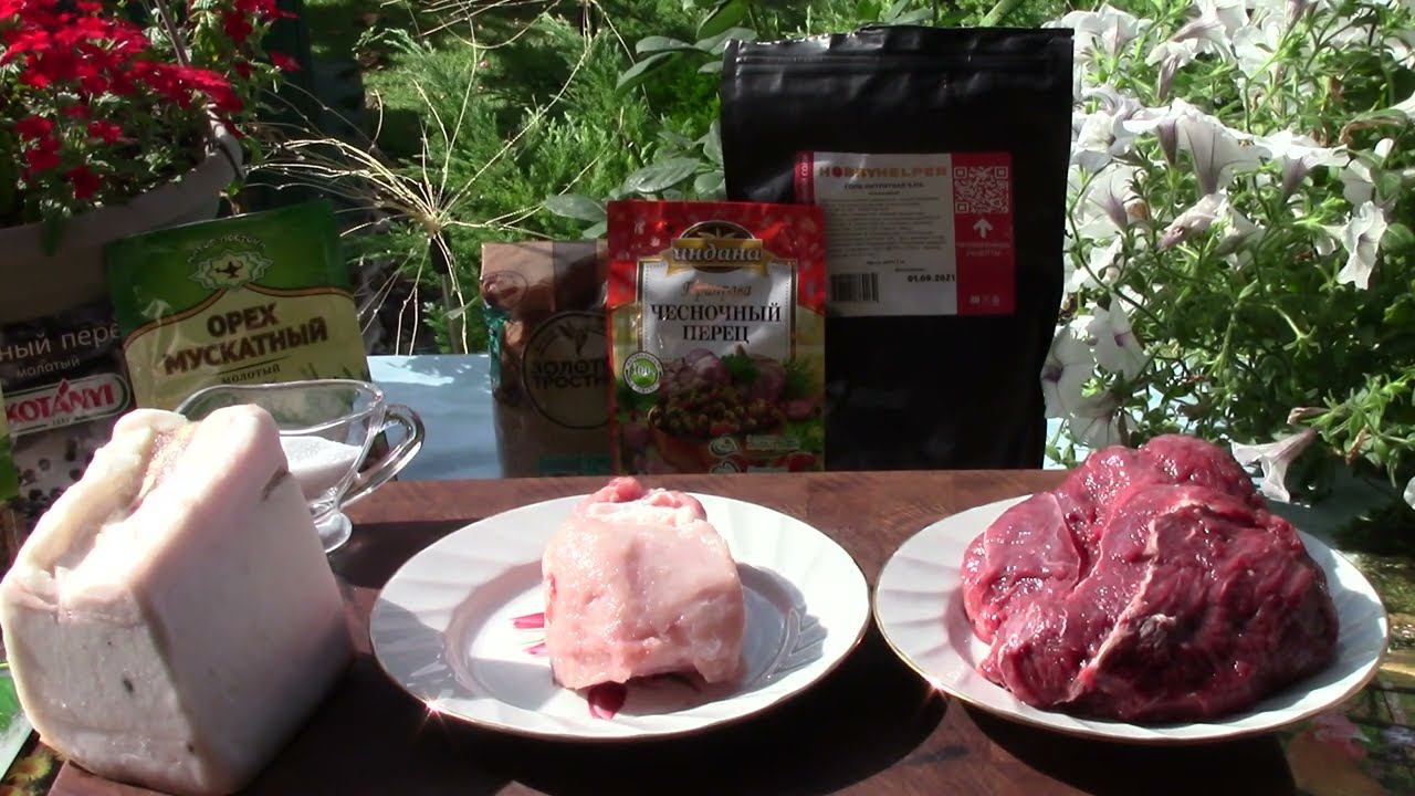 Яндекс Дзен - https://zen.yandex.ru/id/620b3fd678237536da3a759a RuTube - https://rutube.ru/channel/24746918/ В контакте https://vk.com/serdukov1974 Рецепт: Говядина-840 гр(42%) Свинина нежирная - 460 гр.(23%) Шпик -700 грамм(35%) Соль нитритная - 32 грамма (20 грамм на 1 кг) Перец черный - 2 грамма(1 гр на 1 кг) Перец душистый - 1 грамм(0,5 грамма на 1 кг) Мускатный орех - 1 грамм(0,5 грамм на 1 кг) Чеснок сушенный 1 грамм(0,5 грамм на 1 кг.) Сахар - 4 грамма(2 грамма на 1 кг)
