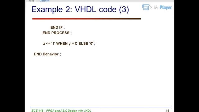 Algorithmic State Machine (ASM) Charts ECE 448 Lecture 9 Algorithmic State Machine (ASM) Charts ECE 448 – FPGA and ASIC Design with VHDL 2 Required reading P. Chu, FPGA Prototyping by VHDL Examples Chapter 5, FSM S. Brown and Z. Vranesic, Fundamentals of Digital Logic with VHDL Design Chapter 8.10, Algorithmic State Machine (ASM) Charts ECE 448 – FPGA and ASIC Design with VHDL 3 Algorithmic State Machine (ASM) Charts ECE 448 – FPGA and ASIC Design with VHDL 4 Algorithmic State Machine representation of a Finite State Machine suitable for FSMs with a larger number of inputs and outputs compared to FSMs expressed using state diagrams and state tables. ECE 448 – FPGA and ASIC Design with VHDL 5 Elements used in ASM charts (1) State name Output signals 0 (False) 1 (True) Condition or actions expression (Moore type) (a) State box (b) Decision box Conditional outputs or actions (Mealy type) (c) Conditional output box ECE 448 – FPGA and ASIC Design with VHDL State Box State box – represents a state. Equivalent to a node in a state diagram or a row in a state table. Contains register transfer actions or output signals Moore-type outputs are listed inside of the box. It is customary to write only the name of the signal that has to be asserted in the given state, e.g., z instead of Also, it might be useful to write an action to be taken, e.g., count count + 1, and only later translate it to asserting a control signal that causes a given action to take place (e.g., enable signal of a counter). State name Output signals or actions (Moore type) ECE 448 – FPGA and ASIC Design with VHDL 7 Decision Box Decision box – indicates that a given condition is to be tested and the exit path is to be chosen accordingly The condition expression may include one or more inputs to the FSM. 0 (False) 1 (True) Condition expression ECE 448 – FPGA and ASIC Design with VHDL 8 Conditional Output Box Denotes output signals that are of the Mealy type. The condition that determines whether such outputs are generated is specified in the decision box. Conditional outputs or actions (Mealy type) ECE 448 – FPGA and ASIC Design with VHDL ASMs representing simple FSMs Algorithmic state machines can model both Mealy and Moore Finite State Machines They can also model machines that are of the mixed type ECE 448 – FPGA and ASIC Design with VHDL 10 Moore FSM – Example 2: State diagram C z 1 = Reset B A w ECE 448 – FPGA and ASIC Design with VHDL 11 Moore FSM – Example 2: State table Present Next state Output state w = 1 z A B C ECE 448 – FPGA and ASIC Design with VHDL 12 ASM Chart for Moore FSM – Example 2 ECE 448 – FPGA and ASIC Design with VHDL 13 Example 2: VHDL code (1) USE ieee.std_logic_1164.all ; ENTITY simple IS PORT ( clock : IN STD_LOGIC ; resetn : IN STD_LOGIC ; w : IN STD_LOGIC ; z : OUT STD_LOGIC ) ; END simple ; ARCHITECTURE Behavior OF simple IS TYPE State_type IS (A, B, C) ; SIGNAL y : State_type ; BEGIN PROCESS ( resetn, clock ) IF resetn = '0' THEN