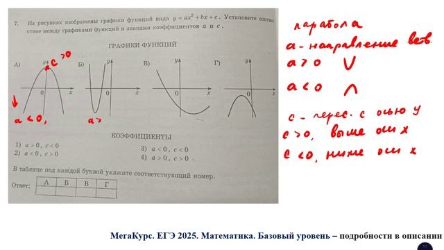 Задание 7 из базового уровня ЕГЭ по математике: На рисунках изображены графики функций вида y=ax^2 + bx + c. Установите соответствие между графиками функций и знаками коэффициентов a и c. В таблице под каждой буквой укажите соответствующий номер. Курс по всем заданиям 1 - 21 базового уровня ЕГЭ по математике: https://stepik.org/a/174709 Группа ВК: https://vk.com/egeroombaza #егэ #математика #база