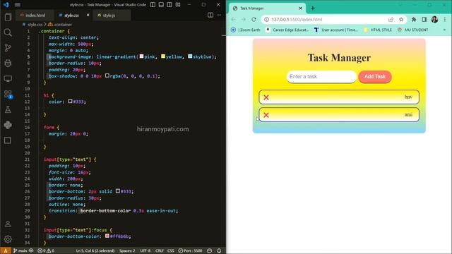 In this task manager you can do your daily tasks and a list of them. Once those tasks are complete, you can cancel them one by one. Then you will know how much work you have done and how much work is still left. One of your jobs through this. There are basically three types of languages used here: HTML, CSS, and JavaScript. This is a key part of font and web development it's starting with. For More Details : https://hiranmoypati.com/task-manager-using-javascript/ Follow In Instagram : https://www.instagram.com/hiranmoy_pati/ Follow In Facebook : https://www.facebook.com/srijit.to Project Link : https://hiran125.github.io/Task-Manager/ #code #codecademy #coding #javascript #frontend #html #css #javascriptproject #html5 #css3
