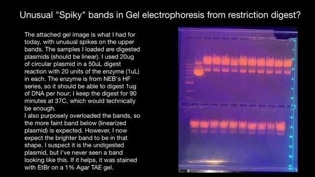 Unusual "Spiky" bands in Gel electrophoresis from restriction digest?