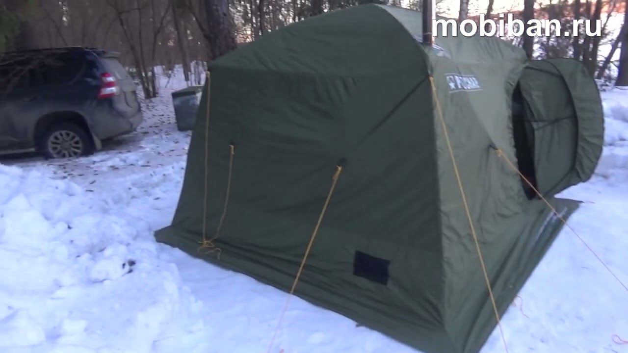 Двухслойная палатка РС-33 из комплекта мобильного банного комплекса РС-33. Палатка позволяет эксплуатацию не только в режиме армейского мобильного банного комплекса, но и как двухслойную отапливаемую палатку с печью длительного горения Согра-3 для отопления. В состав комплекса входит пол утеплённый ПУ РС-33, обеспечивающий теплоизоляцию пола. Установка печи длительного горения Согра-3 и кровати складной КС-400 превращает изделие в удобное жилище для ночёвки. Тест ночёвки в РС-33 с печью Согра-3 ещё впереди... http://mobiban.ru/pech_sogra.php