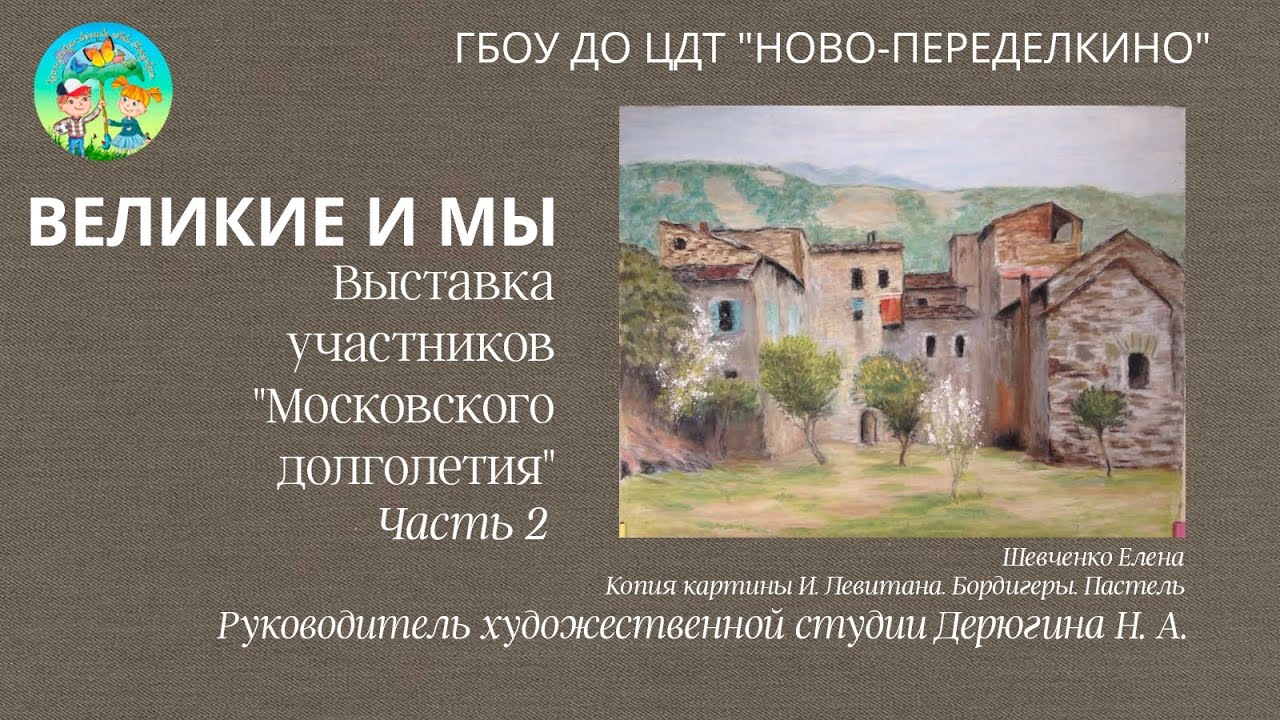 Выставка "Великие и мы". Часть II. Выставка работ участников проекта "Московское долголетие". На выставке представлены копии картин известных художников, а также самостоятельные работы учащихся, выполненные в техниках акварели, пастели, гуаши, графических материалах (карандаш, сепия, уголь, мел, сангина) и масла. Руководитель художественной студии Дерюгина Надежда Александровна. 2020 год Сайт-визитка ЦДТ «Ново-Переделкино»: https://cdtnp.ru/ Мы ВКонтакте: https://vk.com/cdtnp Канал ЦДТ «Ново-Переделкино» в Телеграм: https://t.me/cdtnp Мы на ЯRUS: https://yarus.ru/u/4276394 Яндекс Дзен: https://dzen.ru/id/6321cf839e9593628da8f19a Официальный сайт ЦДТ «Ново-Переделкино»: https://cdtnp.mskobr.ru/