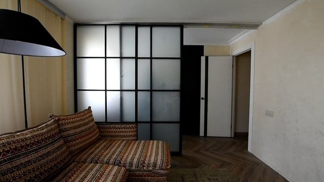 Перегородка для зонирования комнаты раздвижная. Подвисная система, вставка стекло б\ц каленое матовое 4 мм, проем в\ш 3443х2501 мм. Эта раздвижная конструкция состоит из 3-х полотен, на тройной направляющей с каскадным открыванием в проёме. При закрывании перегородки одна дверь тянет за собой последующие, а при открывании толкает их. Такая раздвижная конструкция на верхнем подвесе ещё называется телескопическая или с зацепом. Удобна она тем, что на полу нет направляющей, которая визуально делит комнату на части и вызывает определённый дискомфорт при передвижении. Материал направляющих и профилей - алюминий с красочным покрытием чёрный муар. Вертикальный профиль является ручкой для открывания. Каждая створка разделена тремя горизонтальными и одним вертикальным делителями. Наполнение калёное бесцветное, матовое стекло 4 мм, по 8 вставок в каждом полотне. Рациональное решение разделить большое помещение на гостиную и кухню. Перегородка создаёт атмосферу уюта в квартире, с лёгкостью трансформируя одно большое помещение на две малых зоны. Существует множество квартир, где замечательно встраиваются в интерьер перегородки зонирующие пространство. Такие конструкции имеют различные разновидности открываний, которые подбираются достаточно индивидуально, в зависимости от планировки, геометрии стен, материала потолков и пожеланий заказчика.