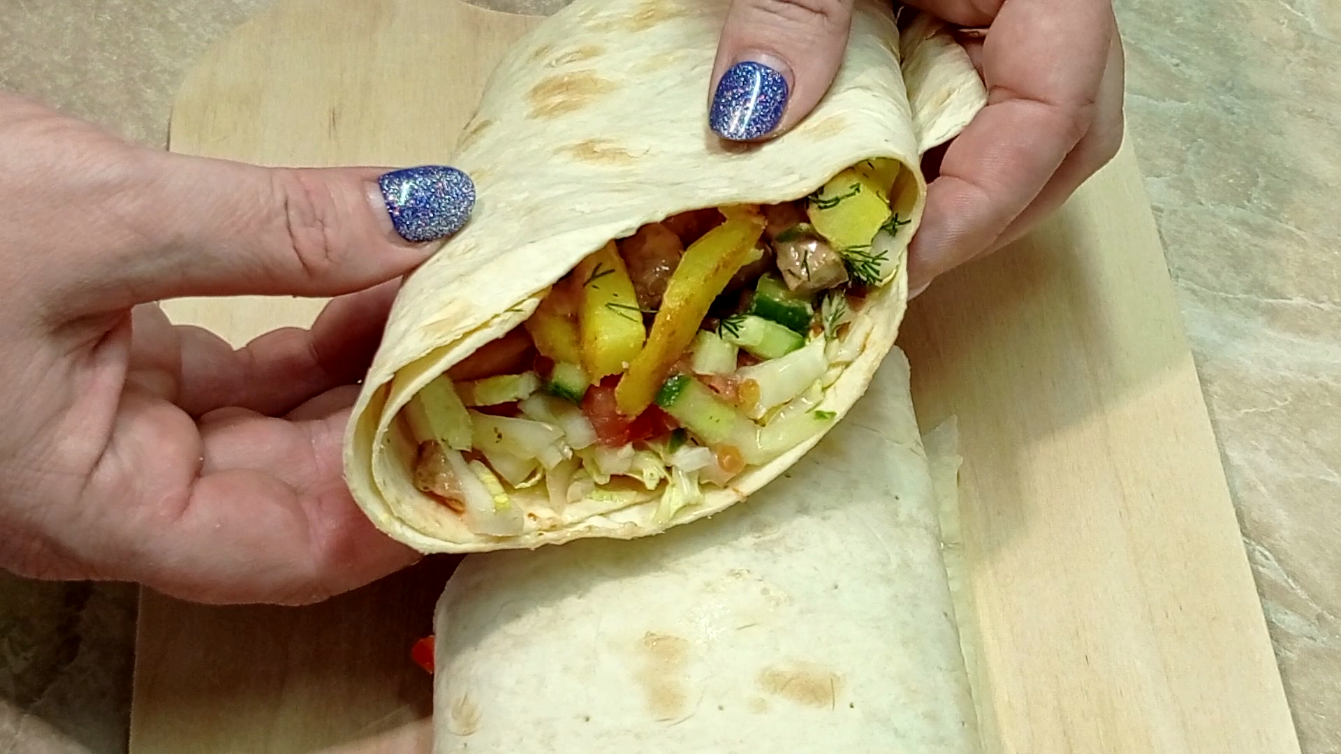 Каждый поймёт, шаурма рецепты, рецепты простые, рецепты быстрые Шаурма с курицей и картофелем Лаваш 1 шт. Куриная грудка 100/150 гр. Картофель 1 шт. Огурец свежий 0,5 шт. Помидор 0,5 шт. Пекинская капуста Масло для обжарки Специи по вкусу, соевый соус Соль Укроп 2/3 веточки Для соуса Майонез, сметана, кетчуп и 1ч.л. воды Куриную грудку нарезаем небольшими кусочками, маринуем 30 минут, в специях с добавлением 1 с.л. соевого соуса Картофель нарезаем брусочками, отвариваем 10 минут до полуготовности, откидываем в дуршлаг, сушим и остужаем что бы на нем не было воды Далее полу вареные брусочки картофеля обжариваем на растительном масле со всех сторон до золотистой румяной корочки. Маринованную куриную грудку обжариваем в небольшом количестве растительного масла Капусту мелко шинкуем Огурец режем соломкой Помидор нарезаем кубиками Делаем соус: В чаше соединяем сметану, майонез, кетчуп и 1 ч.л. воды, все перемешиваем. Сборка шаурмы: Разворачиваем лаваш, смазываем край соусом, выкладываем капусту, огурцы и помидор. Сверху картофель и курицу. Между слоями промазываем соусом. Сверху посыпаем укропом и заворачиваем, как показано на видео.