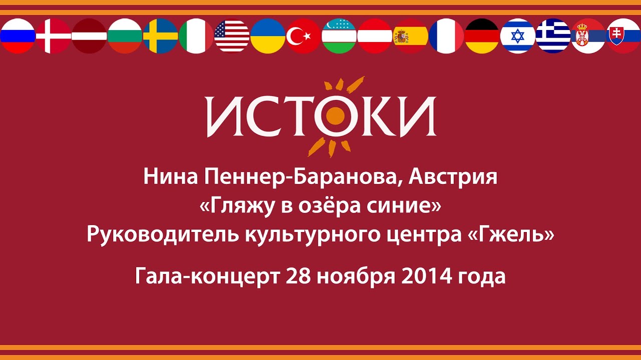 Нина Пеннер-Баранова - «Гляжу в озёра синие» Руководитель культурного центра «Гжель», Австрии Фестиваль-конкурс русской культуры «Истоки» ставит своей задачей показать многообразие и красоту русской культуры, которая на протяжении многих веков формировалась за счет традиций многонациональности и добрососедства. Фестиваль-конкурс русской культуры «Истоки» - многоплановое мероприятие, которое объединяет конкурс вокалистов, обширную экскурсионную и культурную программу, концертные выступления, гала-концерт и награждение участников фестиваля-конкурса. Мы расширяем русскоязычное пространство. Благодаря поддержке Россотрудничества в фестивале принимают участие дети-соотечественники, проживающие за рубежом. Сайт: www.festistoki.ru E-mail: festistoki@mail.ru