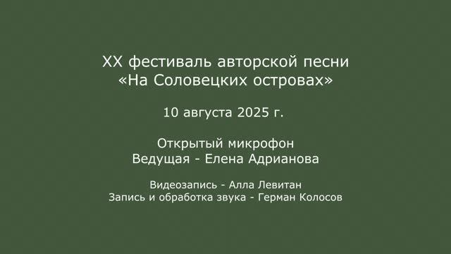 XX фестиваль авторской песни «На Соловецких островах». 10 августа 2025 г. Открытый микрофон. Ведущая - Елена Адрианова. Видеозапись - Алла Левитан. Запись и обработка звука - Герман Колосов.