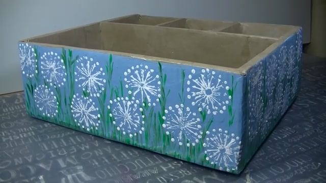 Декор картонной коробки одувнчиками коктельной трубочкой .