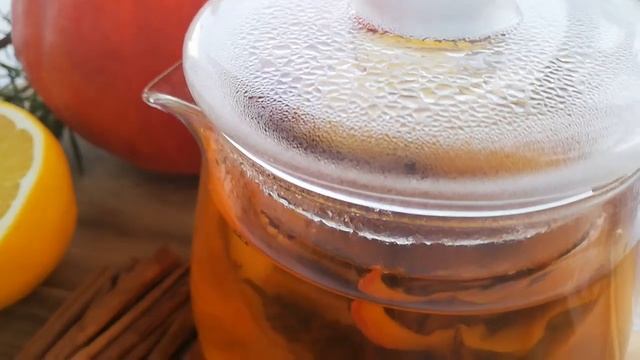 Ингредиенты : Сушёная тыква Хаккайдо - 1 ч. л. Чёрный чай с солёной карамелью - 1 ч. л. Апельсин - 2 кружочка Чёрный перец - 2 шт. Гвоздика - 2 шт. Карица - 1 палочка