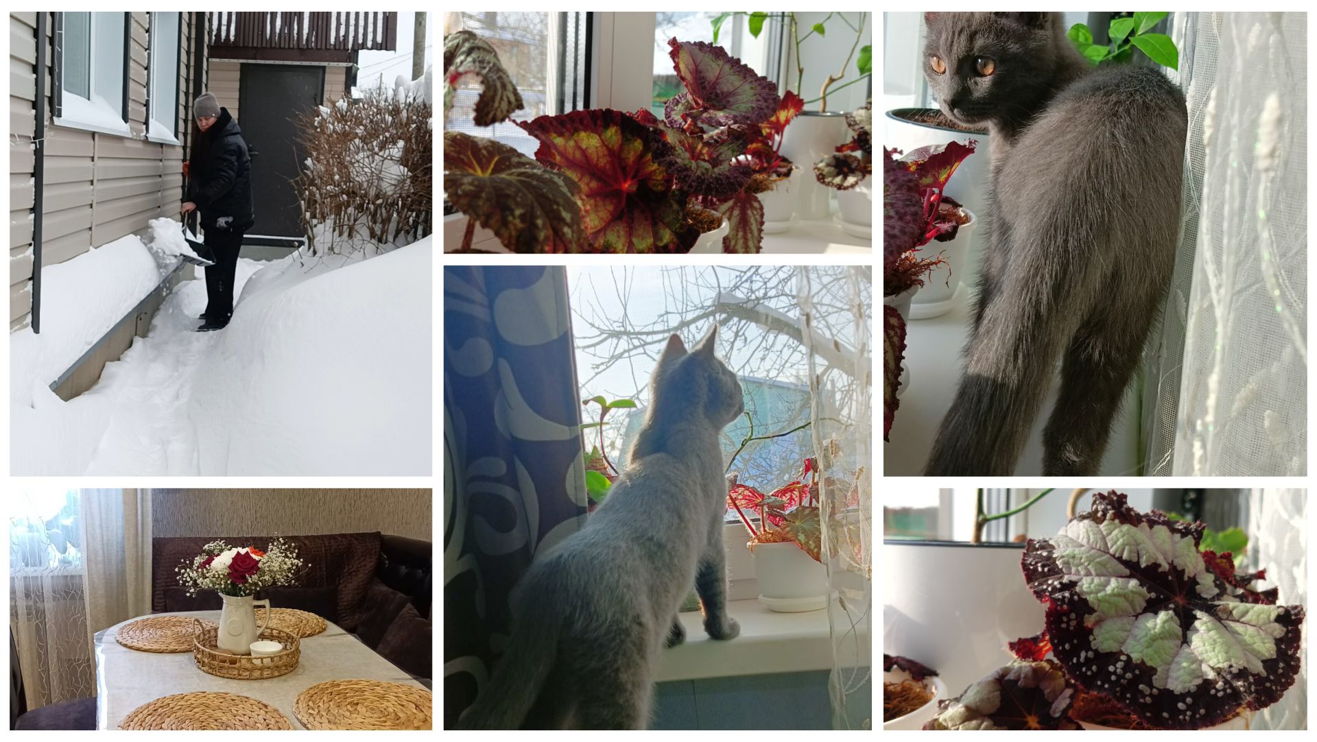 Немного стихли морозы, и вновь начался снег. В этом году у нас во Владимирской области его очень много. Солнце бывает крайне редко, в основном оно спрятано за тучами, и сильно лишь его очертание. На подоконниках расположились цветы, их красивые и сочные листья поднимают настроение в пасмурные и мудрые дни, какое же это наслаждение — любоваться ими. Григорий решил, что цветы на окнах совершенно лишние, и они были отправлены за борт... Подумав, все свои листья выпрыгнули из своих кашпо и лежали на полу. Гриша, конечно, получил и смотрел виноватым взглядом, говоря: «Понять и простить!» Бегонии были посажены обратно в кашпо, а сломанные листья, которые удалось собрать, поставлены на укоренение.
