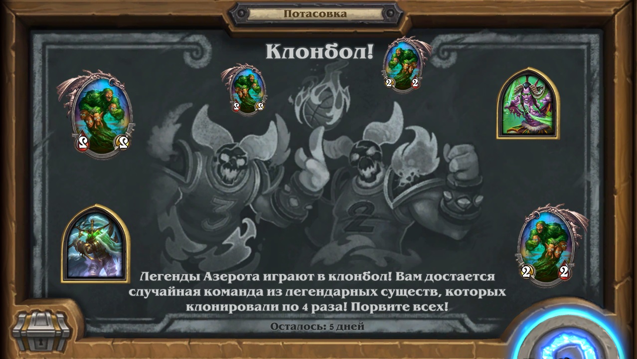 Потасовка в Hearthstone, в период с 11.08.2022 - 18.08.2022 Потасовка: Клонбол! Легенды Азерота играют в клонбол! Вам достаётся случайная команда из легендарных существ, которых клонировали по 4 раза! Порвите всех!