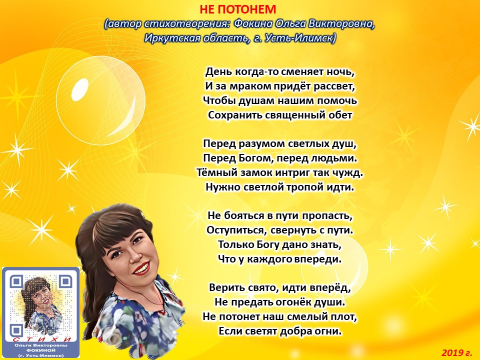 Читает автор стихотворения: ФОКИНА ОЛЬГА ВИКТОРОВНА (Иркутская область, город Усть-Илимск) СТИХИ: https://stihi.ru/2018/07/08/3790 БИОГРАФИЯ: http://www.proza.ru/2019/10/08/1473 ВЫИГРЫВАЙТЕ КНИГИ БЕСПЛАТНО: https://proza.ru/2017/09/17/447 ОТЗЫВЫ ЧИТАТЕЛЕЙ: http://www.proza.ru/2019/11/29/611 Из книги Фокиной Ольги Викторовны (Усть-Илимск) «Несу добро в ладошках!»: [все стихотворения с 2005 по октябрь 2020 гг., проза, авторские песни, интервью]. – Москва: МГО Союза писателей России, 2020 г. – 886 стр., ил. ISBN 978-5-7949-0826-8 НЕ ПОТОНЕМ (автор стихотворения: Фокина Ольга Викторовна, Иркутская область, г. Усть-Илимск) День когда-то сменяет ночь, И за мраком придёт рассвет, Чтобы душам нашим помочь Сохранить священный обет Перед разумом светлых душ, Перед Богом, перед людьми. Тёмный замок интриг так чужд. Нужно светлой тропой идти. Не бояться в пути пропасть, Оступиться, свернуть с пути. Только Богу дано знать, Что у каждого впереди. Верить свято, идти вперёд, Не предать огонёк души. Не потонет наш смелый плот, Если светят добра огни. 4 февраля 2019 г.