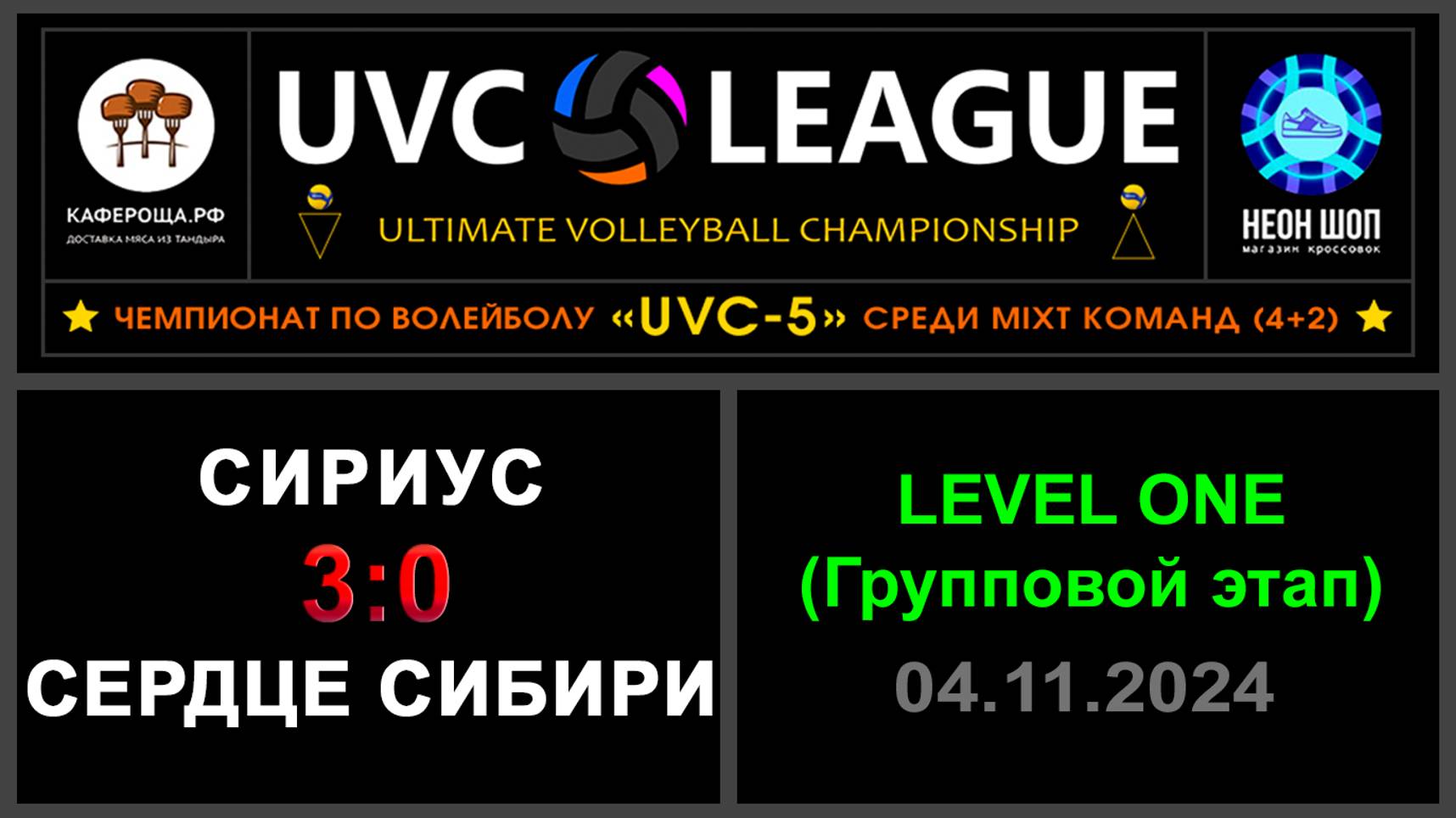 UVC-5 (Mixt): Чемпионат UVC Лиги по волейболу среди MIXT команд (4+2), 2024-2025 гг. Результаты игры: LEVEL ONE (Групповой этап) 04.11.2024 Сириус - Сердце Сибири 3:0 (25:14, 25:18, 25:16) Конкурса «РЕШАЛА»: ⁉Сириус не прошел 4й этап, но пока это не означает, что команда завершила своё участие в конкурсе! ⛔Сердце Сибири завершило своё участие на третьем этапе! Конкурса «Робин Гуд»: ⛔Точных попаданий не было! #UVC_ЛИГА_ЧЕМПИОНАТ_UVC_5_Mixt