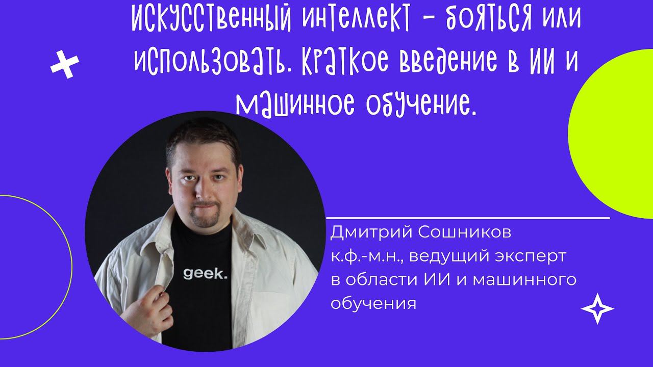 Искусственный интеллект – бояться или использовать. Какие инструменты использовать школьнику, чтобы попробовать ИИ в действии. На лекции от ведущего эксперта по ИИ и машинному обучению Дмитрия Сошникова узнаем: Как может быть устроен искусственный интеллект Что искусственный интеллект может сегодня, в чем он превзошел человека Какие инструменты использовать школьнику, чтобы попробовать ИИ в действии Как с помощью ИИ понять, какие фотографии в Instagram вызовут симпатии аудитории СЕРТИФИКАТ СКОЛКОВО х MICROSOFT ДЛЯ ДЕТЕЙ Приходи на все 6 лекций цикла и получи диплом о прохождении курса! Узнай все подробности в Телеграм-канале: https://t.me/skolkovokids