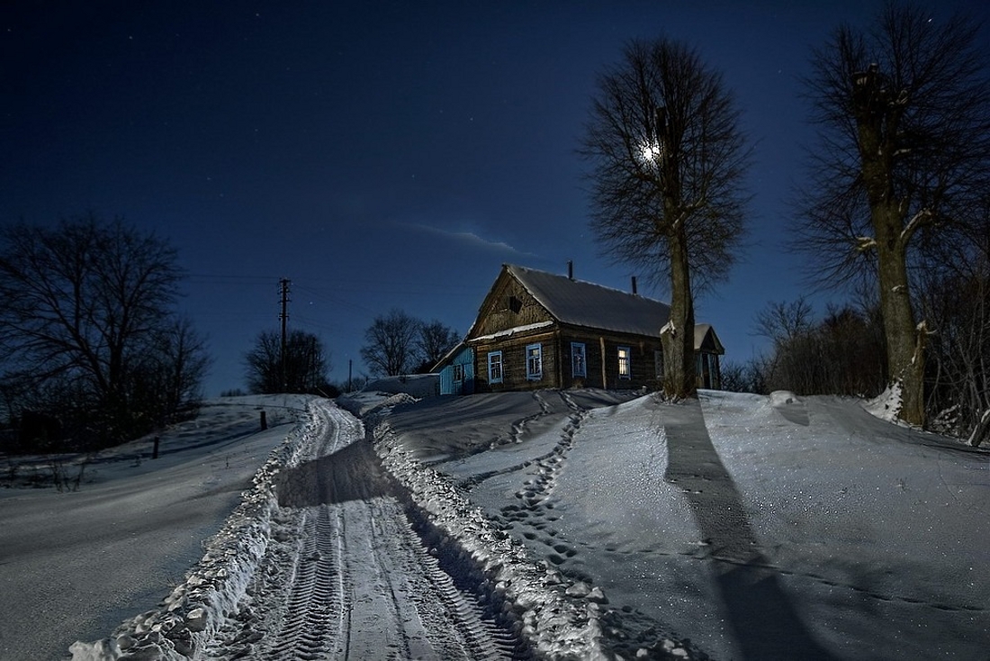 Печоры-Псковские. Недалеко от железнодорожного вокзала. Скрипит снег под ногами. Лает собака. Мороз все крепчает. Такую луну моя мама называла "голодной". - "В эту пору волки голодные бегают. И луна с ними. Заячьи следы им подсвечивает." Я в гостях. Хозяйка сковороду жареной картошки с салом и луком уже поставила на стол а я вышел "до ветру" и обомлел от увиденного. Хорошо смартфон в кармане всегда ношу... Это же фото "оживленное" мною с помощью спец. программы. https://cloud.mail.ru/public/6Enn/Trv7TQhek