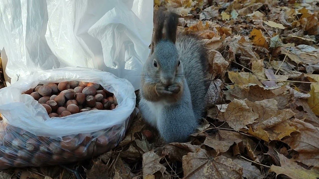 Белка прячет орехи рядом с мешком