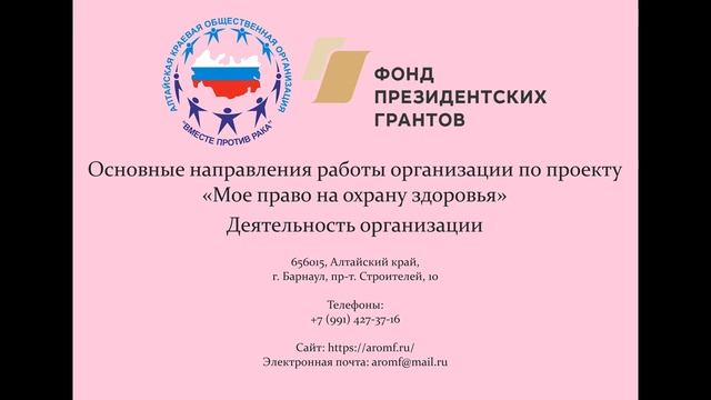 Автор - Иванова Людмила Ивановна. Запись от 12 ноября 2019 г. Видео подготовлено в рамках реализации проекта «Мое право на охрану здоровья», который реализуется с использованием гранта Президента Российской Федерации на развитие гражданского общества, предоставленного Фондом президентских грантов Больше информации на нашем сайте https://aromf.ru/