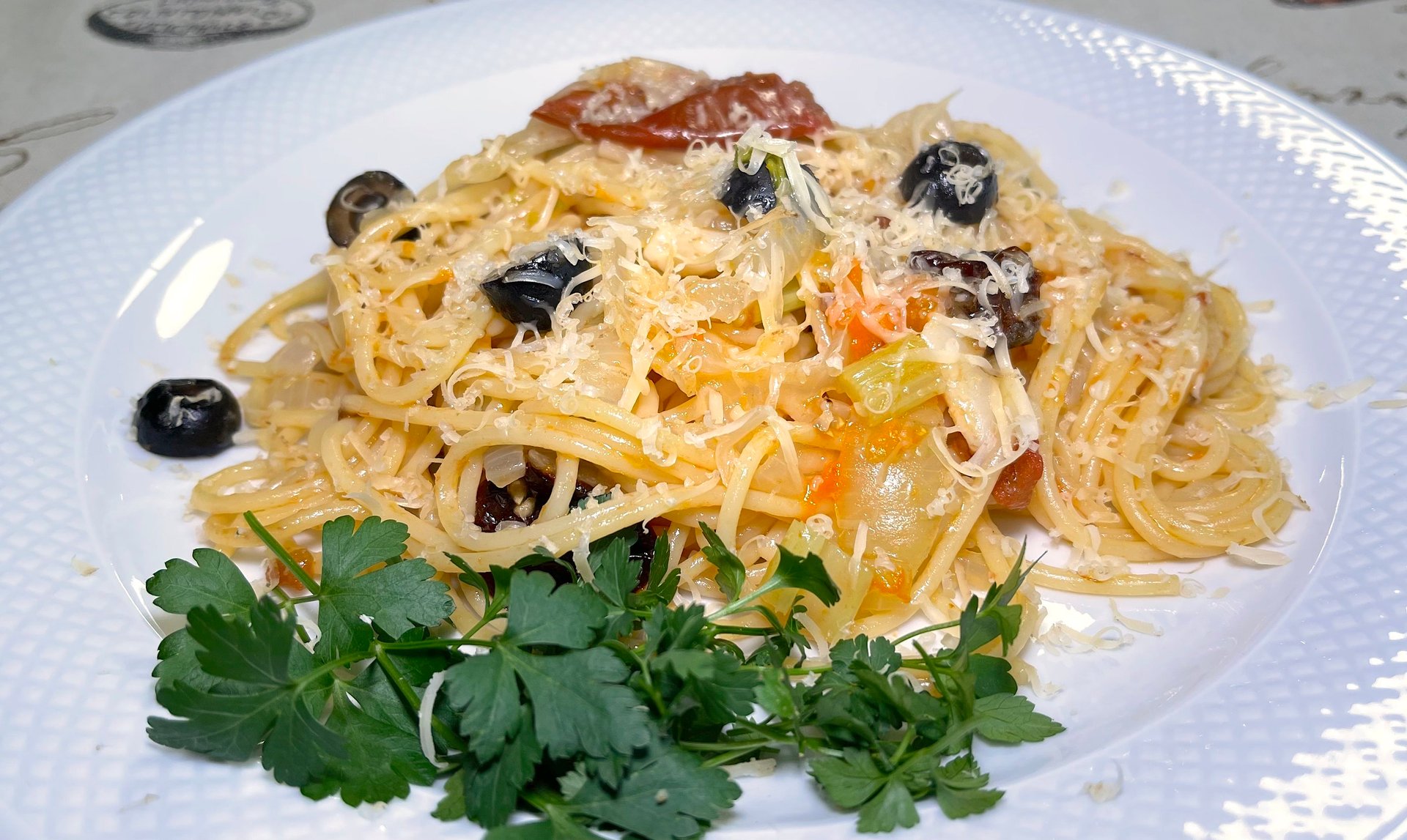 Рецепт очень прост ... часть макарон, часть лука, часть помидор и часть воды ... все в сковородку ... можно добавить чеснок, маслины, сушеные томаты ... соль ... готовить 10-15 минут ... сверху посыпать твердым сыром! Приятного аппетита!