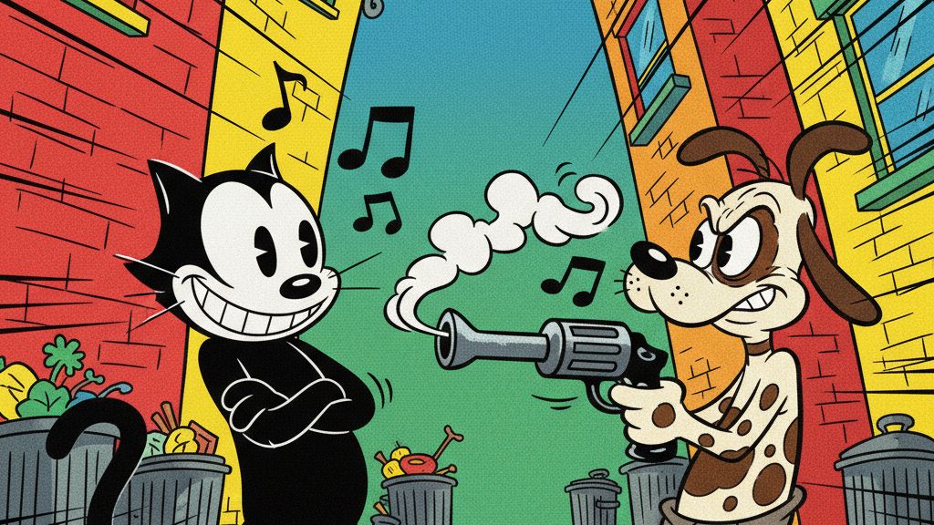 Кот Феликс против собаки с пистолетом.