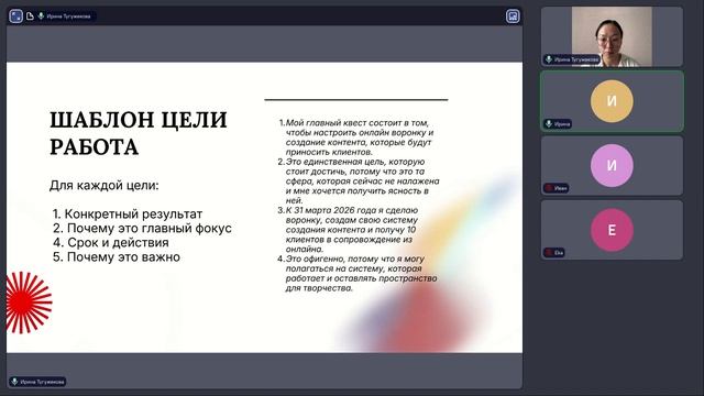 В этой записи групповой коуч‑сессии мы вместе планируем следующие три месяца. Начинаем с разговора о том, зачем вообще нужно планирование в условиях неопределённости и тревожности, и как оно помогает вернуть внутреннюю опору. Затем проводим медитацию‑визуализацию, разбираем, как из образов вытащить конкретные цели на квартал, как их формулировать (конкретно, измеримо, с ответом «почему это важно»), как декомпозировать на шаги и отслеживать прогресс. Также обсуждаем, как важны сон, окружение и привычки, чтобы «сменить идентичность» и приблизиться к своему будущему образу. В конце – подведение итогов и приглашение в коучинговое сопровождение.