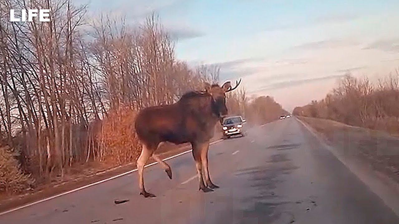 Лось-терминатор с разбегу протаранил машину