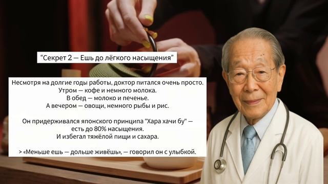 Почему японцы живут дольше всех в мире? 🇯🇵 Что помогает им сохранять здоровье, энергию и молодость даже после 90 лет? В этом видео мы расскажем о докторе Сигэки Хинохаре, который прожил 105 лет и оставил человечеству свои секреты долголетия. Вы узнаете: 🌿 Что едят японцы для здоровья и долголетия; #здоровье #безлекарств #долголетие 🚶♂️ Как их ежедневные привычки продлевают жизнь; 🧘 Почему внутреннее спокойствие важнее диет и лекарств. Эти советы просты, но они меняют жизнь. Посмотрите видео до конца — и узнайте, как применять японскую философию долголетия каждый день. 👍 Поддержите канал лайком и подпишитесь, чтобы не пропустить новые видео о здоровье и долголетии! #долголетие #япония #здоровье #СигэкиХинохара #японскиесекреты #здоровыйобразжизни #мотивация #энергия #жизньпосле100