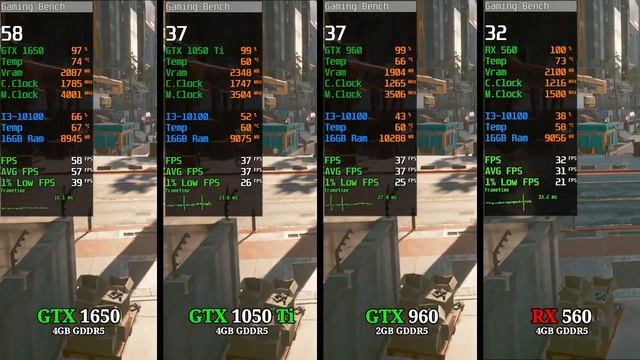 GTX 1650 vs GTX 1050 Ti vs GTX 960 vs RX 560 - Test In 7 Games! =======(MY PC SPEC)======= Processor : I3-10100 3.60Ghz 10th Gen Ram : 16gb 2666mhz GPU : RX 560 4GB GDDR5 GPU : GTX 1650 4GB GDDR5 GPU : GTX 1050 Ti 4GB GDDR5 GPU : GTX 960 2GB GDDR5 Recorder : Shadow Play & Relive OS : Windows 10 - Version 21H2 =======(Timestamps)======= 0:00 God Of War 1:16 Dying Light 2 2:42 Elden Ring 3:52 Cyberpunk 2077 5:07 Cod Warzone 6:22 Forza Horizon 5 8:07 Days Gone =======(Social Media)======= Instagram ► https://www.instagram.com/gaming_bench/ Facebook ► https://www.facebook.com/Gaming-Bench-109041743952058/ ===== Disclaimer:- These video games are a work of fiction. The vehicles, weapons, fighting, blood, etc. may have been adjusted to fit into these video games. All characters appearing in these games are fictitious. Any resemblance to real persons, living or dead, is purely coincidental. There is no relation between these video games with real life. ========================== Thanks for Watching!