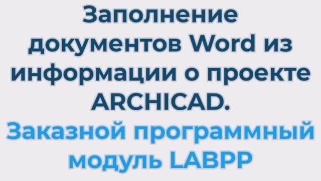 Автоматический вывод в Word - заполнение данных из автотекста ARCHICAD в поля документа. Показано как из информации о проекте ARCHICAD берется название проекта и ФИО архитектора и вставляется в нужные места документа Word. Это делается автоматически. Для этого сначала в документе Word создаются специальные свойства: низвание проекта и архитектор. Они размещаются в тексте документа Word в нужном месте или даже в нескольких местах. Теперь в ARCHICAD в плагине LABPP выбирается на диске и запускается файл программного модуля. В результате из ARCHICAD в документ Word попадают изменные значения указанных полей. Можно заказать такой модуль себе для автоматизации вывода документации в Word.