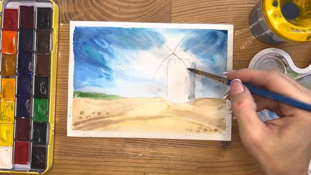 Как нарисовать мельницу карандашом и акварелью начинающим | Рисунок для детей