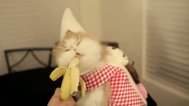 Кошка в костюме ест банан