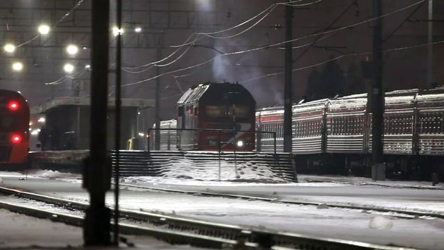 Тепловоз ТЭП70БС-020 с поездом Минск - Мурманск, станция Новгород-на-Волхове. Из Новгорода на Мурманск поезд пойдет под электровозом ЭП2К, но это будет уже почти в три часа ночи. Diesel locomotive TEP70BS-020 with a train Minsk - Murmansk. Novgorod-na-Volkhove station. Velikiy Novgorod. 2015-02-01 00.30