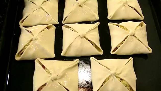 Очень вкусные слоёные пирожки-конвертики с курицей, готовятся очень быстро и просто. Совет: при выпекании слоёных пирожков можно поставить на дно духовки небольшую ёмкость с горячей водой - тогда пирожки получатся ещё мягче. Продукты: Слоёное бездрожжевое тесто Куриное филе Помидоры Сыр Маринад для курицы: 3 ст. ложки соевого соуса 1 ч. л. мёда соль, перец, прованские травы щепотка молотого чеснока выпекать при t 200 гр. 15-20 минут. После выпекания можно смазать пирожки сливочным маслом и накрыть на некоторое время полотенцем – тогда они будут еще мягче и вкуснее.