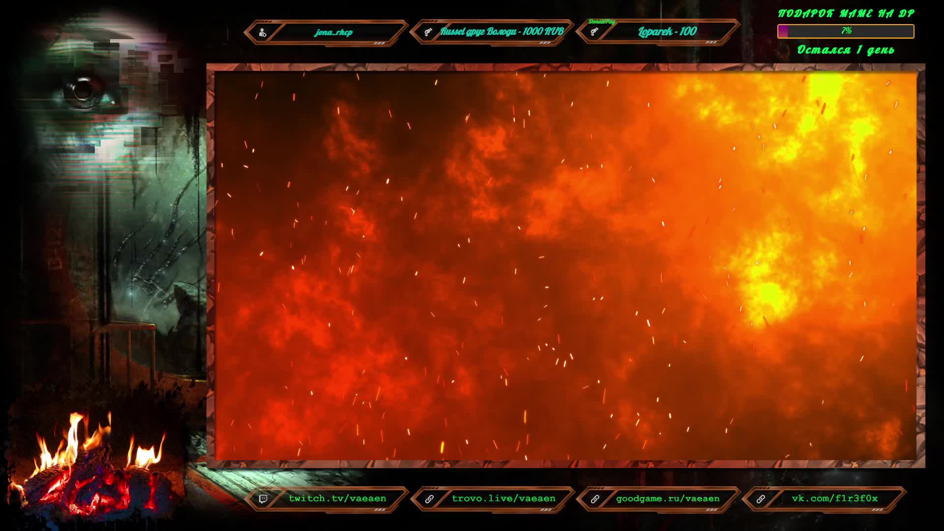 Если хотите поддержать меня как стримера - нажмите по данной ссылке https://www.donationalerts.com/r/f1r3f0x Donate for USD, EU all world - https://new.donatepay.ru/@vaeaen Во время стрима ваше сообщение появится на экране, и будет сопровождаться голосовым диктором. Поддержка на прямую: Сбер: 2202 2010 0629 1039 Тинькофф: 2200 7008 4677 0625 Основные каналы: Twitch: https://www.twitch.tv/vaeaen GoodGame: https://goodgame.ru/channel/Vaeaen/ Trovo: https://trovo.live/Vaeaen Дополнительные: Boosty: https://boosty.to/vaeaen VKplay: https://vkplay.live/vaeaen Wasd: https://nuum.ru/channel/vaeaen YouTube: https://www.youtube.com/channel/UCsl3CyRcImUYtWiCgEdvmjQ