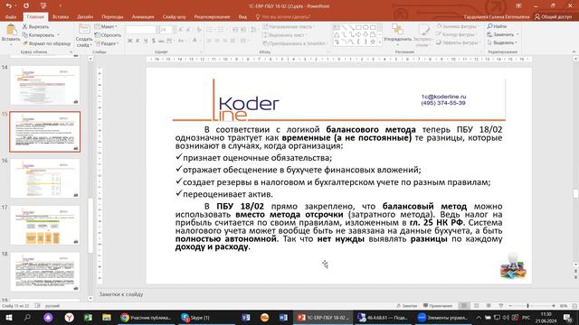 Компания «Кодерлайн» провела вебинар «1С:ERP. ПБУ 18/02» Ведущая: Гардышева Галина - консультант-аналитик 1С:ERP Целевая аудитория для бухгалтеров, пользователей и специалистов ИТ-подразделений компаний различных отраслей. Описание ПБУ 18/02 является одним из самых сложных разделов налогового учета. Разбираемся, как это работает, какие настройки выполнить, и какие изменения произошли в учете по этому разделу на примере 1С:ERP. Программа 1. Новые изменения, кто освобождён от применения, учетная политика предприятия по налогу на прибыль; 2. Разница между методами учета; 3. Настройки 1С:ERP; 4. Закрытие месяца и регламентированная отчетность по налогу на прибыль; 5. Показатели, которые теперь каждый квартал будут сверять налоговики; 6. Дополнительные сервисы, отчеты.
