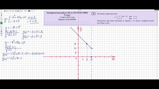 Вариант МА 2490404 ОГЭ математика задание 22 2025 март 9 класс Постройте график функции система-х2+10х-21 -х+5 Определите при каких значениях m прямая y m= имеет с графиком ровно две общие точки