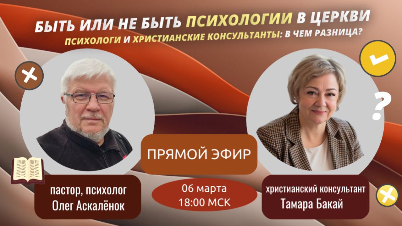 🎙️Встреча с пастором, психологом, коучем Олегом Аскаленком и христианским консультантом, коучем Тамарой Бакай Вопросы: ✅ Как психология может помочь людям в церкви. Как психологические методы, могут помочь христианам. Почему знания психологии помогают пастору? ✅ Кто такой христианский консультант? Какими особенными качествами должен обладать христианский консультант? Где можно применить навыки христианского консультирования? ✅ Почему важно христианину найти свре предназначение и служить на том месте, где он призван? ✅Рекомендуем подписаться на каналы: Тамара Бакай https://vk.com/hristianskiykonsultant Олег Аскаленок https://vk.com/id289483628 🎁Материалы в подарок🎁 "Как найти свое предназначение и стать христианским консультантом" https://vk.com/app5898182_-167377063#u=2031316&s=3573702 ✔️Информация о курсе "Как стать христианским консультантом" 👇 https://vk.com/app5898182_-167377063#u=2031314&s=3595313